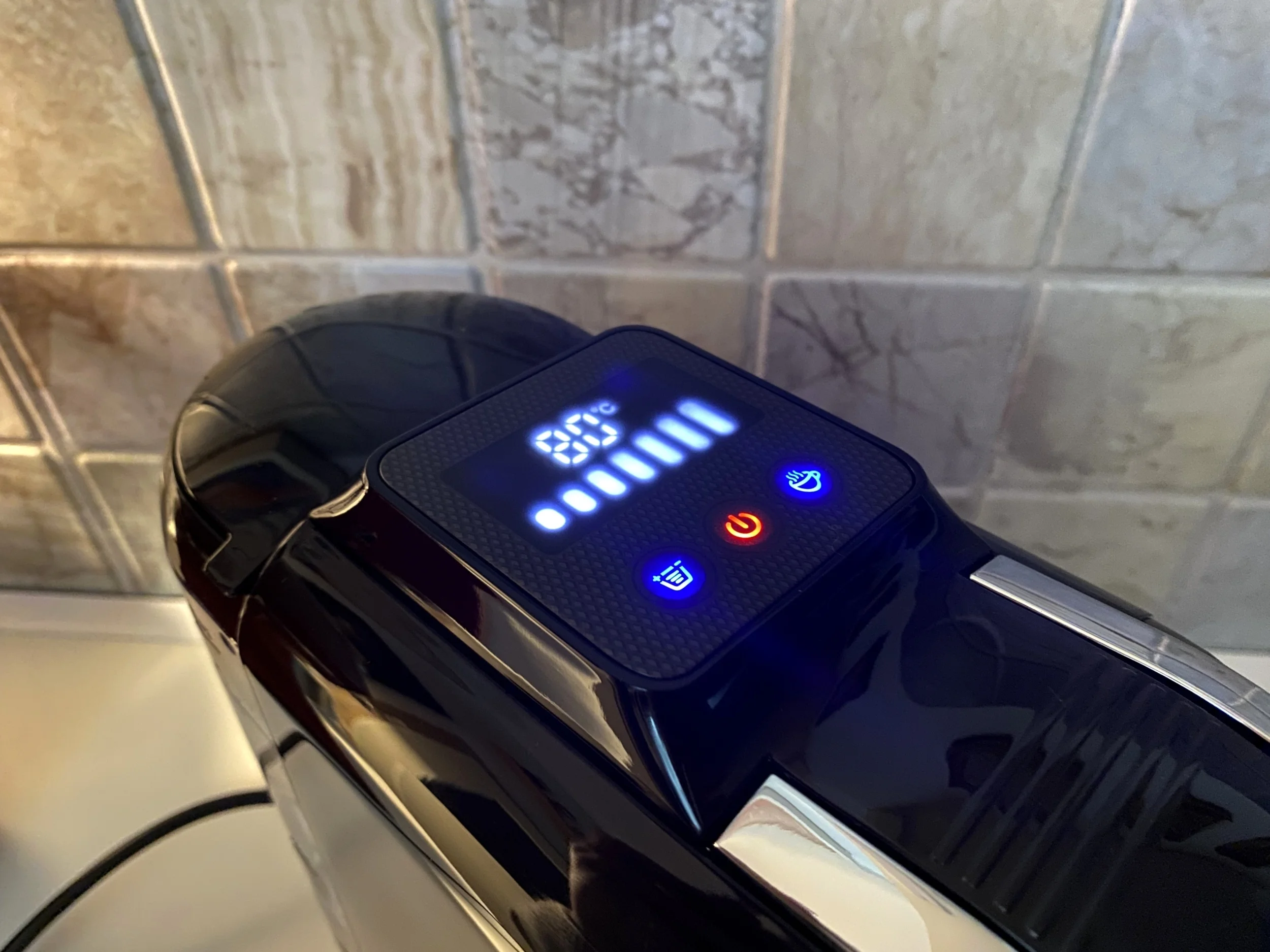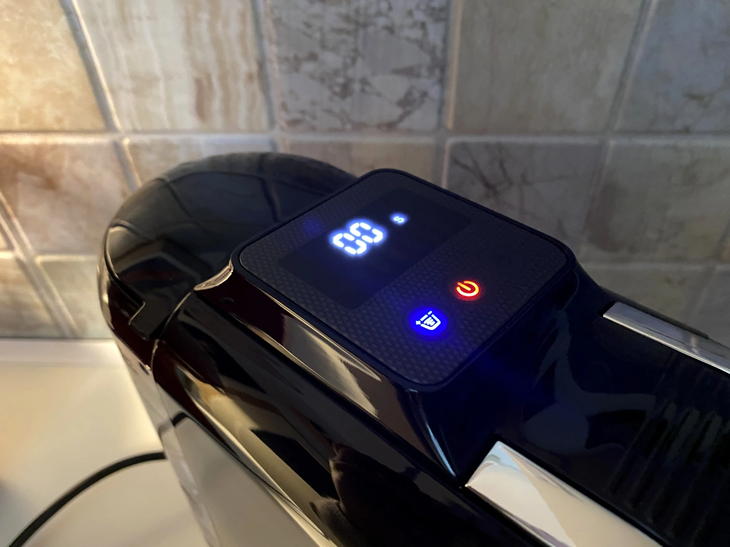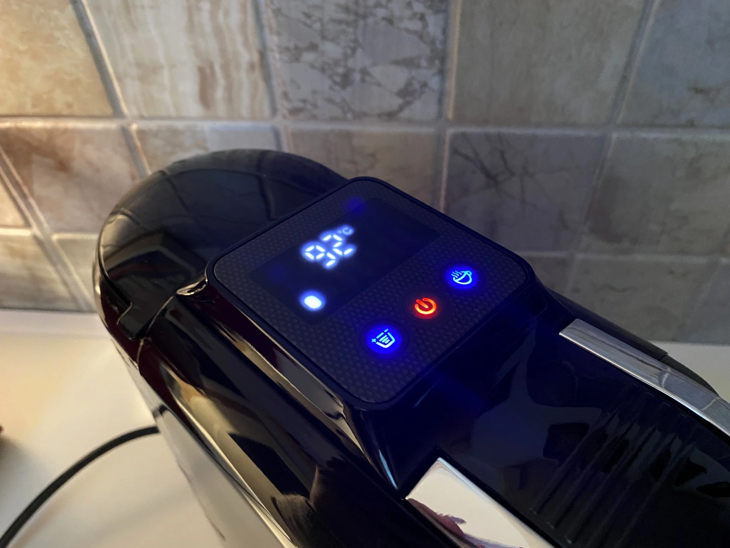 The predecessor model, the H2B, had a very simple control panel on top, with three buttons, and this was retained in this version, only given a new, more modern look. The middle button, when pressed briefly, is used to turn the machine on and off, and when pressed for a long time, theoretically allows you to switch between hot and cold options, but in practice this did not happen. No matter how many seconds I held it down, it never turned blue, although according to the description it should indicate cold, but I could not achieve this in any other way. The red color remained, which clearly indicates a hot end result. It is true that cooling coffees are best sold in the summer, but it would be a super convenient feature if it worked, but my failure remained a mystery worthy of a Scooby-Doo.