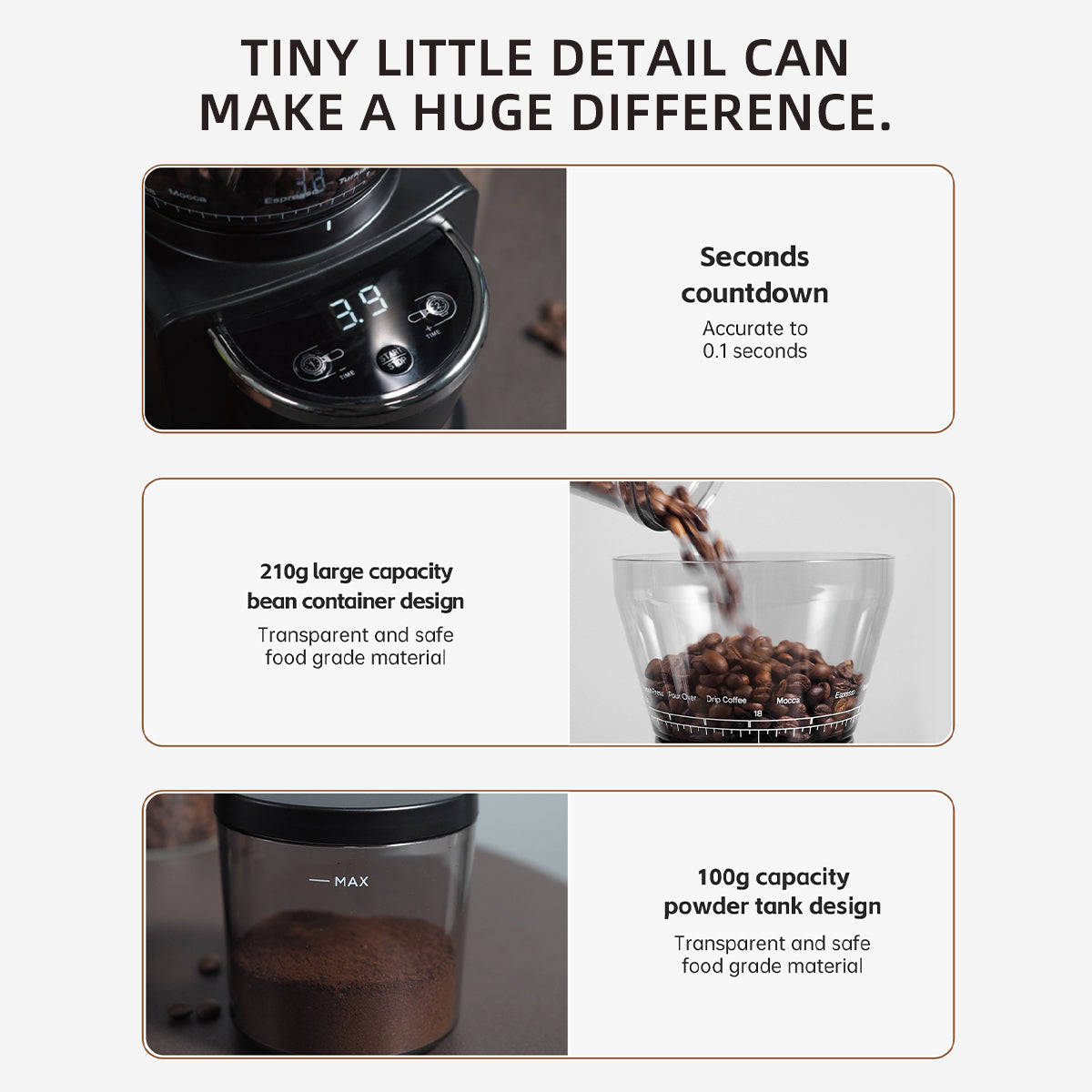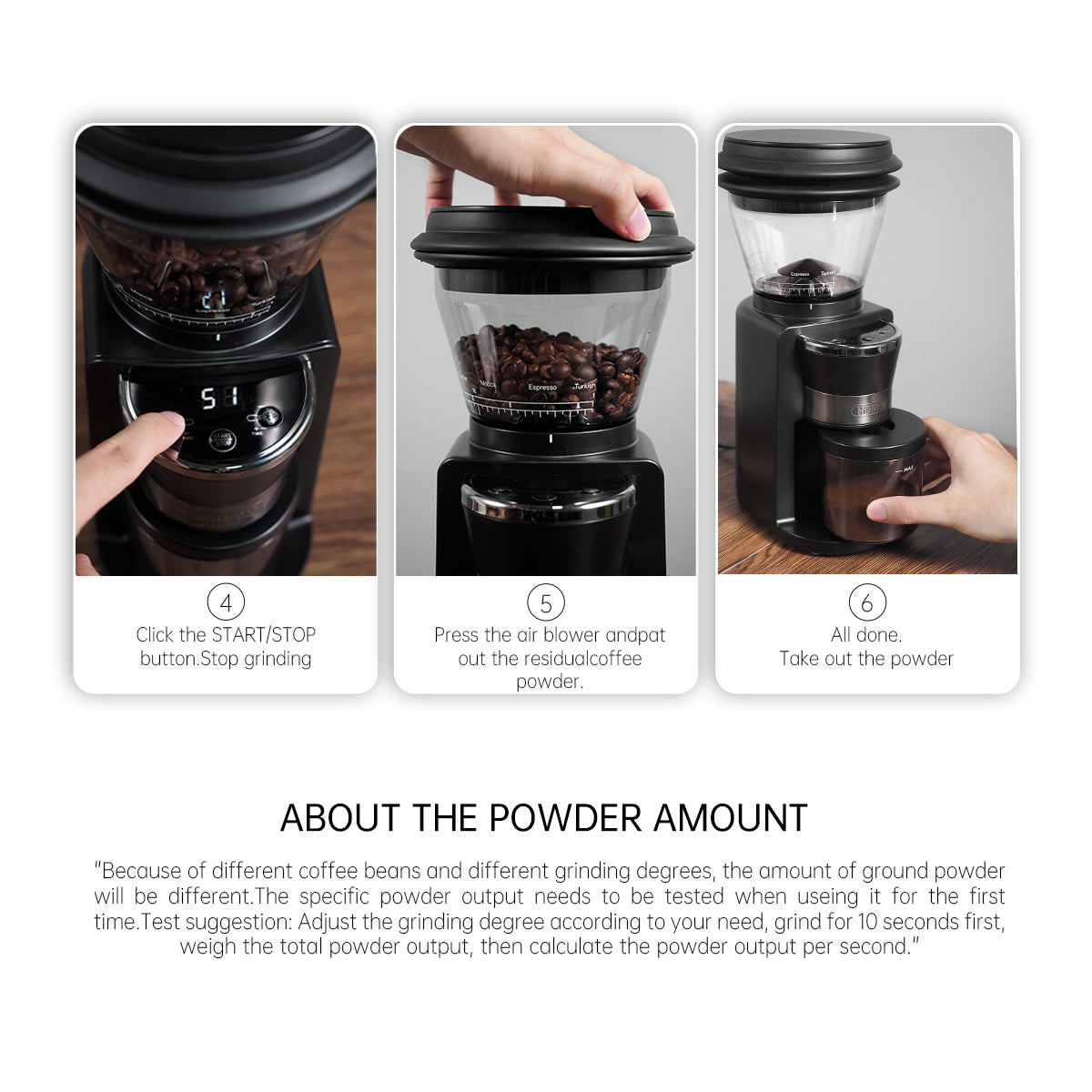 Double-layer air blower removes 99% residue. Keeps your coffee fresh and mold-free with zero leftover powder after grinding.