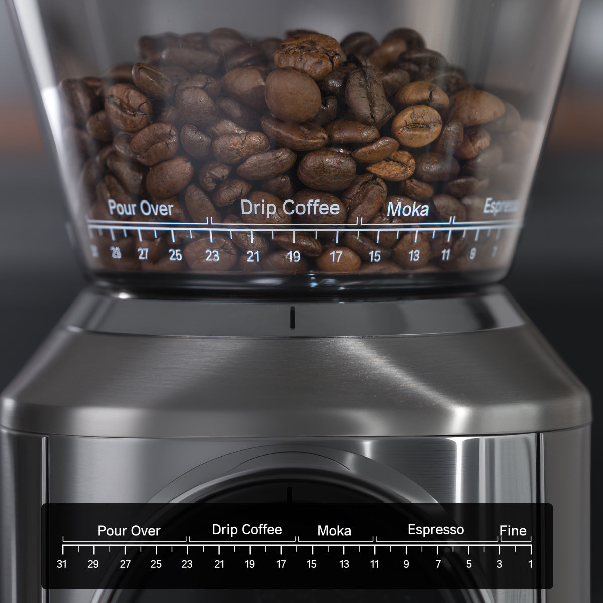 With 31 precise grind settings, the HiBREW G3 Plus covers everything from fine espresso to coarse pour-over. The visual guide helps you select the perfect grind for your preferred brewing method.