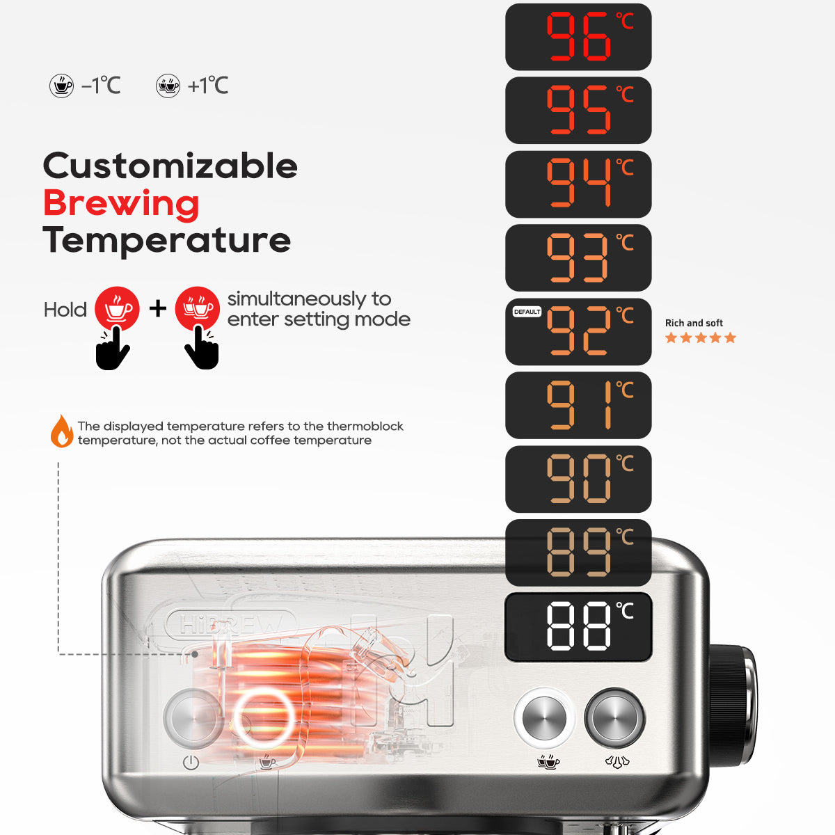 Hold both buttons to enter temperature setting mode. Fine-tune your brew between 88°C and 96°C to match your coffee’s unique profile.