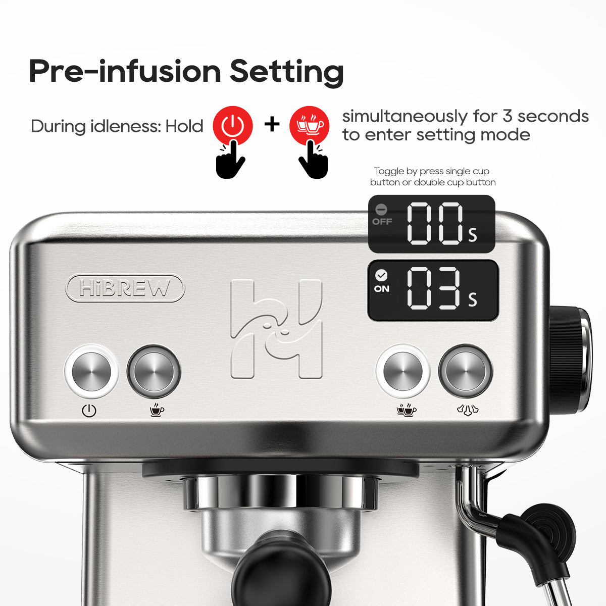 Activate pre-infusion mode by holding both buttons for 3 seconds while idle. Toggle ON/OFF with a tap—enhancing flavor depth and ensuring even extraction.