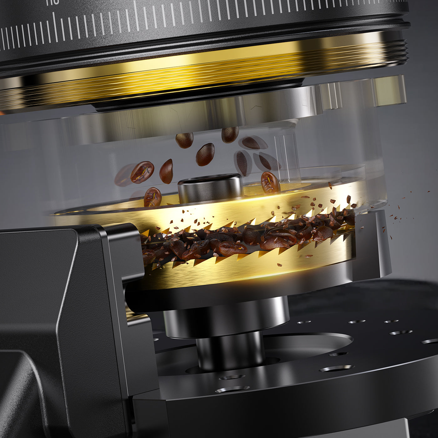 The burr is made of stainless steel, 64 mm flat burrs with atitanium coating. It supports afull grinding range, suitable for Turkish, espresso, andpour-over coffee.