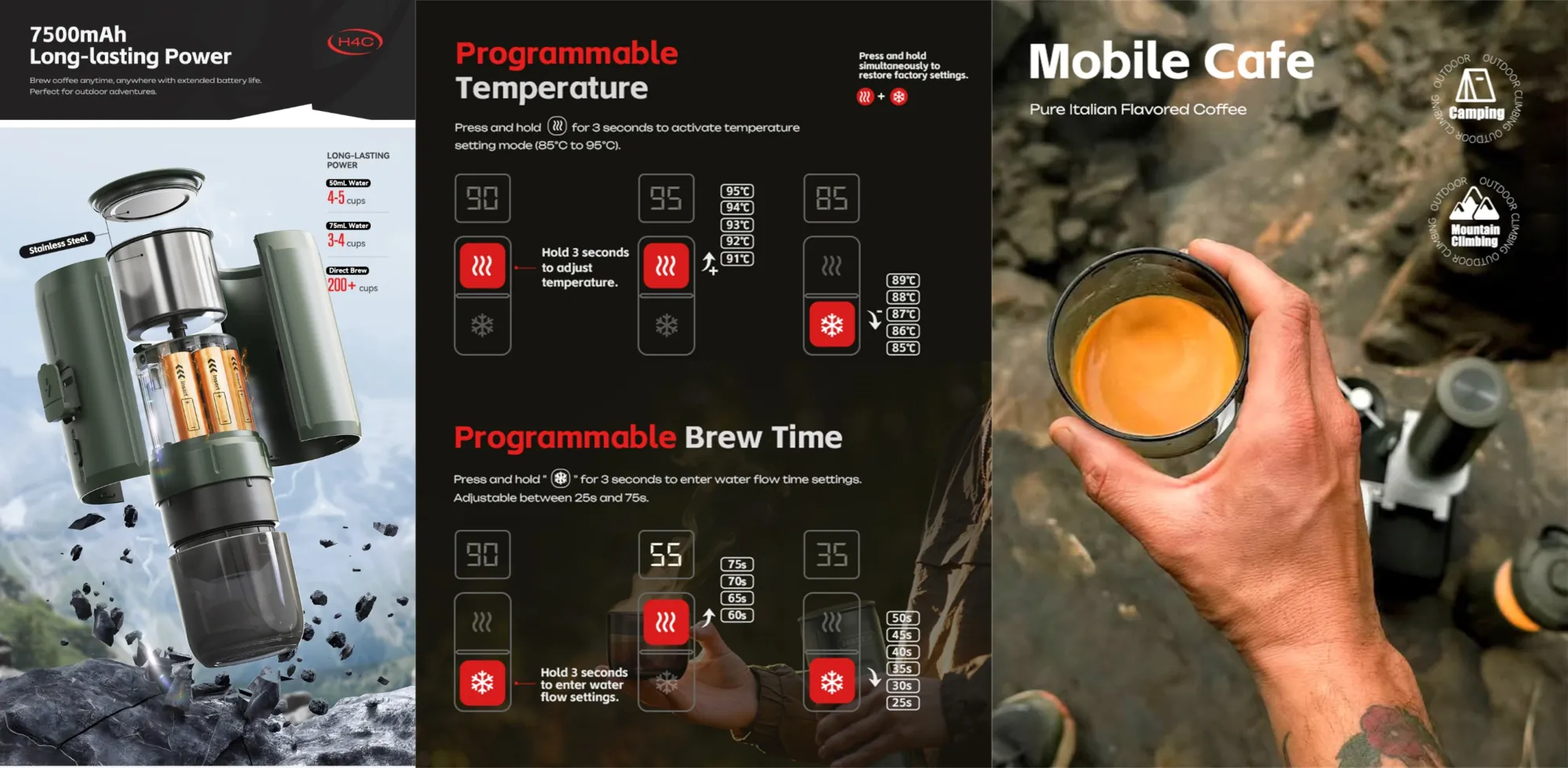 Coffee makers have been in the news lately. The BlitzHome CM 5XXX series wasn't a success story, so I was really hoping that the Hibrew H4C would finally solve one of the big problems of coffee making: portability. The 4C is designed for this, heating water with an 18650 battery, which in theory can make black soup for several people from ground coffee, Nespresso and Dolce Gusto capsules.