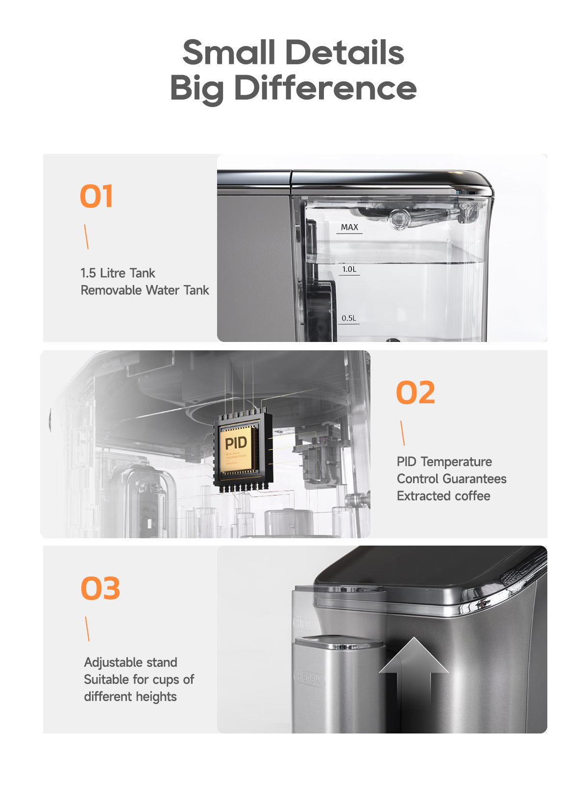 Featuring a durable stainless steel conical burr grinder with 15 grind levels, the H16 lets you customize the grind size for optimal flavor.