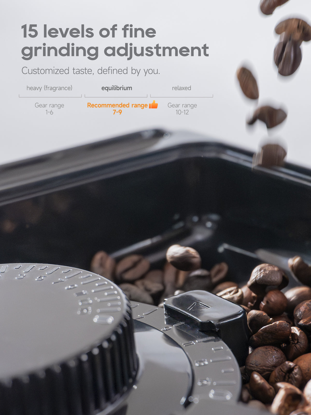 Featuring a durable stainless steel conical burr grinder with 15 grind levels, the H16 lets you customize the grind size for optimal flavor.
