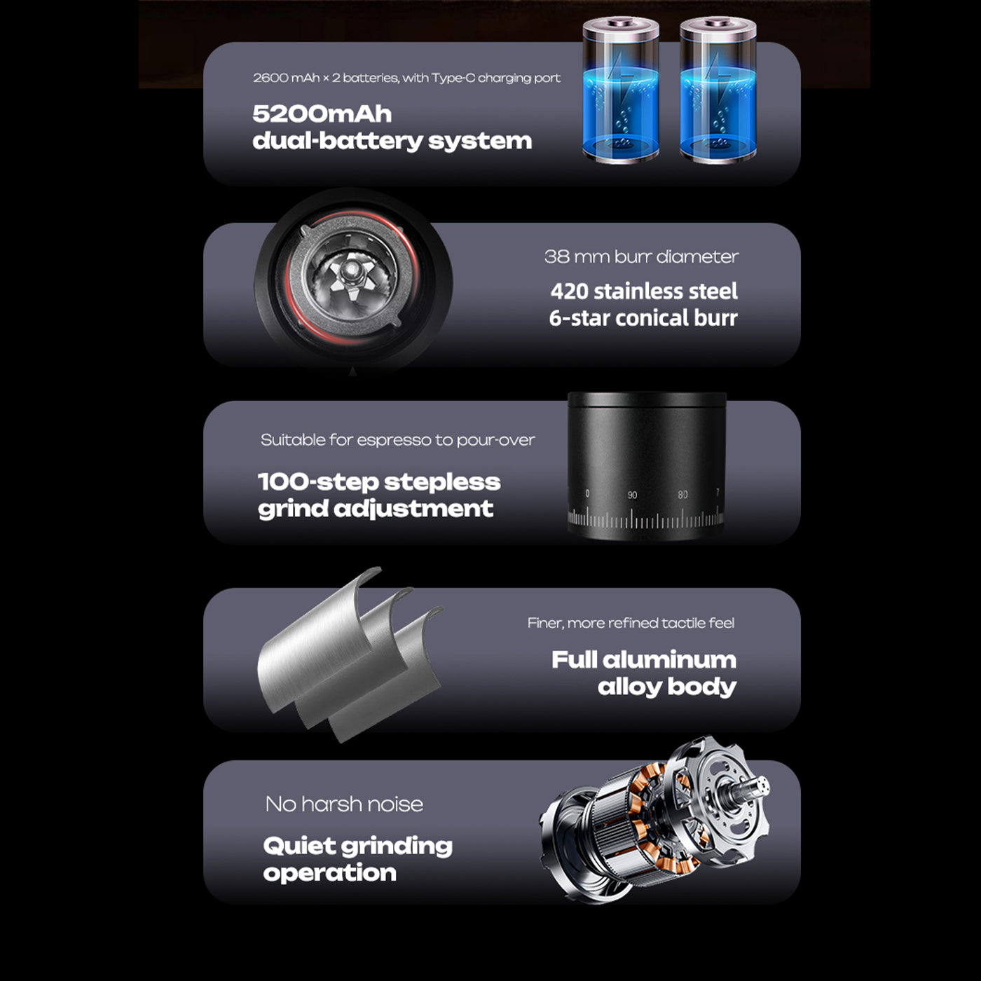 HiBREW G5mini Portable Electric Coffee Grinder features a 38mm 420 stainless steel conical burr with 100-step stepless grind adjustment, perfect for espresso to French press. Powered by a dual-battery system with 5200mAh capacity and Type-C fast charging, it offers quiet operation and durable aluminum alloy build. Ideal for home, office, or travel. Shop now for fresh coffee anytime, anywhere!