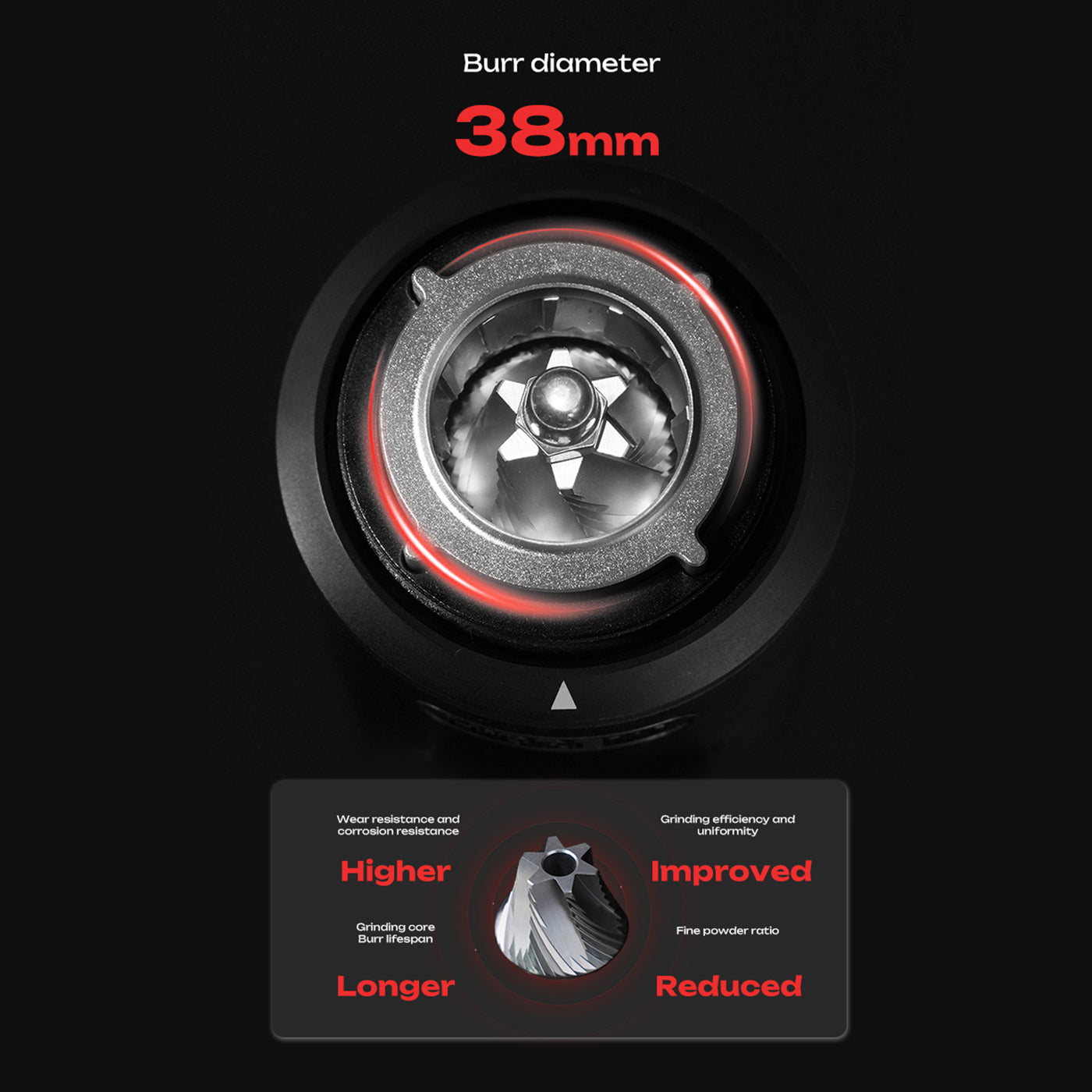 · Materials: Aluminum body, plastic hopper, dial ring and pad, stainless steel burrs