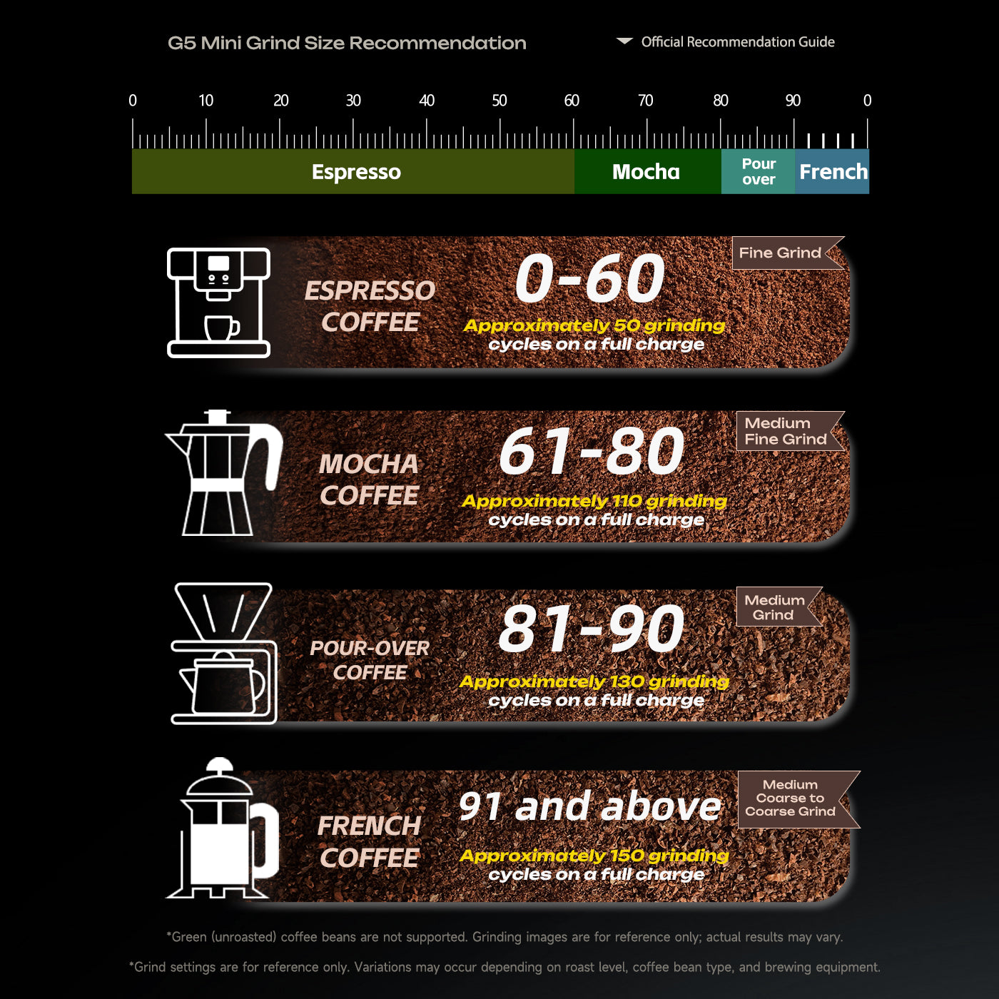 Note: Does not support green (unroasted) beans. Grind settings may vary by roast level, bean type, and equipment.